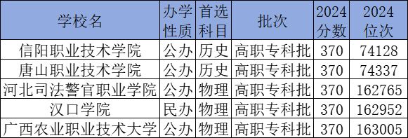 历史类370分能上的有信阳职业技术学院、唐山职业技术学院;物理类370分能上的有河北司法警官职业学院、汉口学院、广西农业职业技术大学。