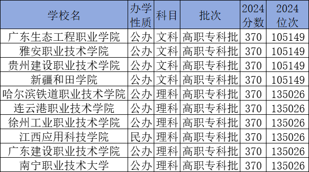 文科370分能上的大学有广东生态工程职业学院、雅安职业技术学院、贵州建设职业技术学院、新疆和田学院;理科370分能上的大学有哈尔滨铁道职业技术学院、连云港职业技术学院、徐州工业职业技术学院等。