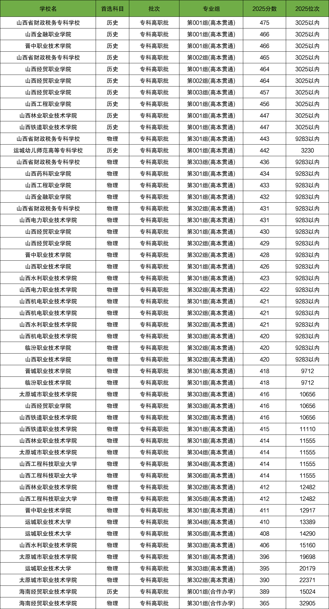 2025年山西“3+2”学校的分数线均在365分及以上,而该年度山西专科线为100分,最低分已经超专科线265分,最高分超专科线375分,如果在专科线上300分左右,基本可以稳上。