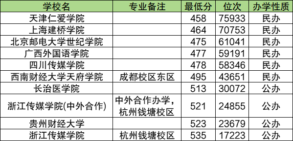 在文科二本招生的传播学大学有9所,录取分数线最低的是天津仁爱学院(民办),2024年最低分458分;录取分数线最高的是浙江传媒学院,2024年最低分535分。最低分公办二本传播学大学为长治医学院,2024年最低分513分。