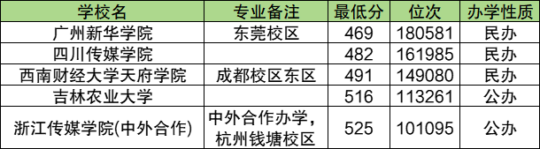 二本传播学分数线排名前三的还有:贵州财经大学523分、浙江传媒学院(中外合作)521分。分数线最高的民办二本传播学大学为西南财经大学天府学院,2024年最低分495分。