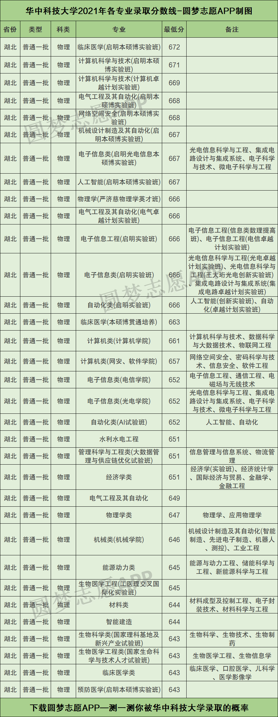 以上王牌专业的评价仅以录取分数线为标准,如果你想看:教育部官方认定的华中科技大学王牌专业名单,请直接下载圆梦志愿APP进行查看(各大手机应用市场,均可下载圆梦志愿APP)