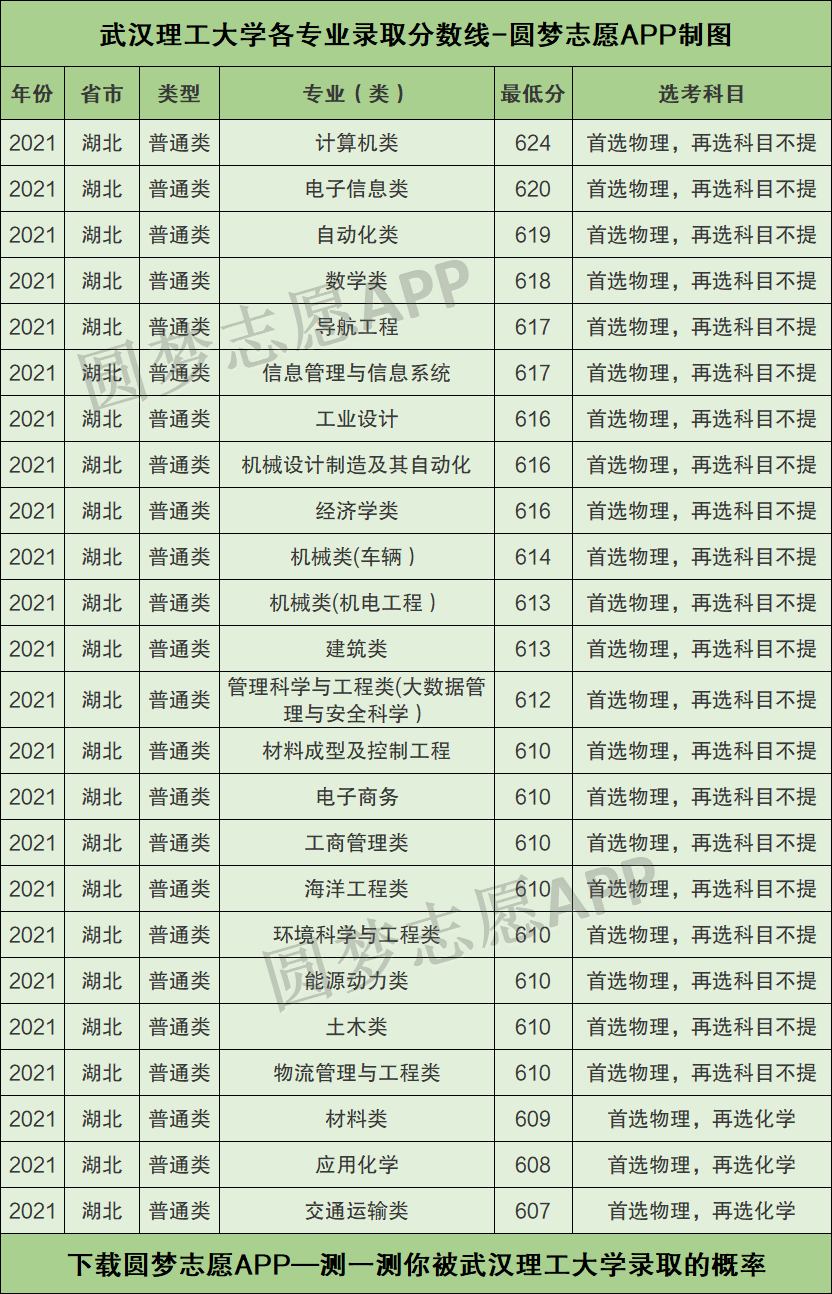 一、武汉理工大学各专业录取分数线2021是多少分?