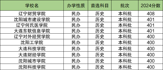 2024年辽宁十大民办大学历史类招生分数线范围在400分~408分之间,历史类考生至少要达到本科线(400分)才能报考。