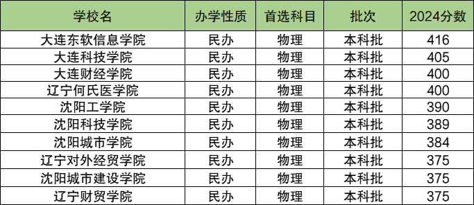 2024年辽宁十大民办大学物理类招生分数线范围在375分~416分之间,物理类考生至少要超本科线(368分)7分以上才能报考。