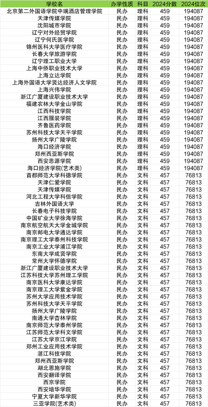 文科二本线最低的民办大学是三亚学院(艺术类)、宁夏大学新华学院、西安培华学院等,2024年最低分为457分,刚好为本科二批线分数,对应最低位次为76813名。