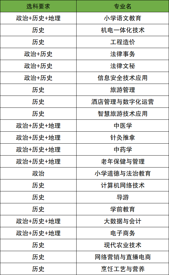 要求选科历史的专业:机电一体化技术、工程造价、旅游管理、酒店管理与数字化运营、智慧旅游技术应用、计算机网络技术、导游、学前教育、现代农业技术等;