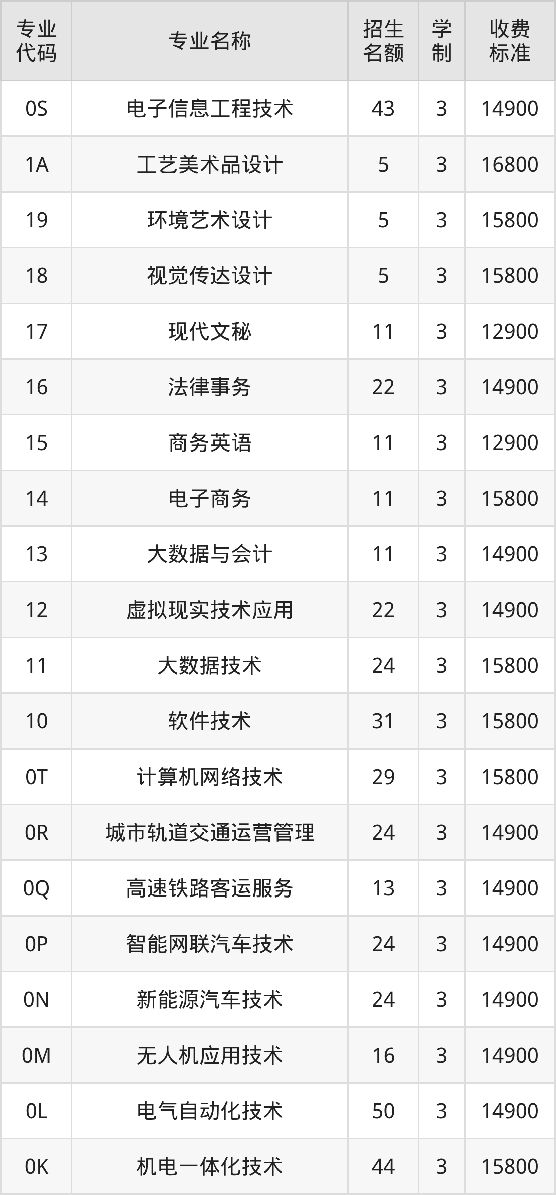 | 专业 代码 | 专业名称 | 招生 名额 | 学 制 | 收费 标准 |