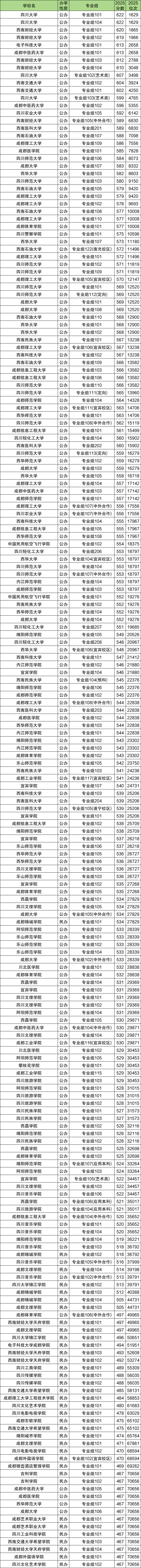 这是最集中的分数段,覆盖了大量优质公办本科。成都理工大学、西南石油大学、四川农业大学、成都信息工程大学构成中坚力量。此区间选择极多,关键在于 “专业组” 的差异化选择。分数优势不大的考生,可重点关注 宜宾校区、中外合作、定向培养 等类型,它们通常录取位次更低,是进入心仪大学的有效途径。