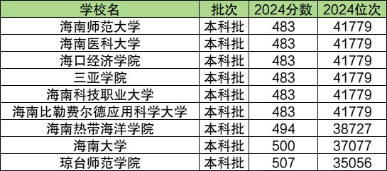 海南各本科大学最低录取位次范围在35056名~41779名之间,对应的最低分为483分~507分。其中海南考生最难上的大学是琼台师范学院,全省高考排名在35056名以内才有可能会被录取。
