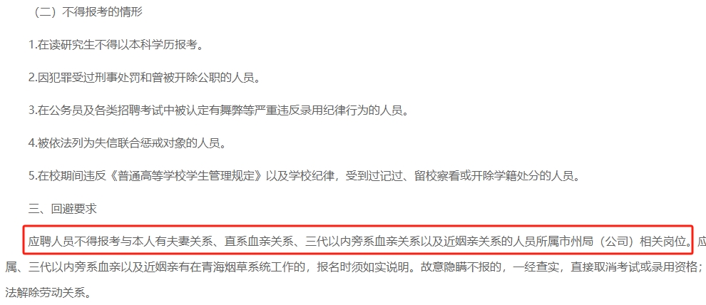 烟草局之所以被劝退,是因为的网络上有很多人都说“只有关系户才能进”,甚至有人说体制内的好职位都是“世袭制”。但从一些烟草局发布的招聘信息来看,小编觉得进烟草局是各凭本事,这些言论的不见得是真的。山东省、山西省、青海省等多个烟草局都在招聘要求中明确提出任职回避要求,要求报名者不得与在岗职工有夫妻、直系等关系。