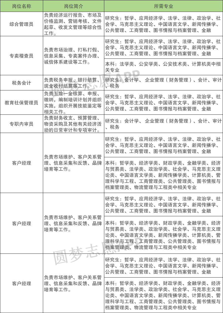 烟草局的岗位大致可分为三类:业务类、专卖类和综合类。业务类主要和营销、物流相关,专卖类工作一般是负责发放烟草专卖许可证等工作,综合类有的会负责人事管理,有的是负责财务。岗位不同,招聘要求和专业要求都不一样。