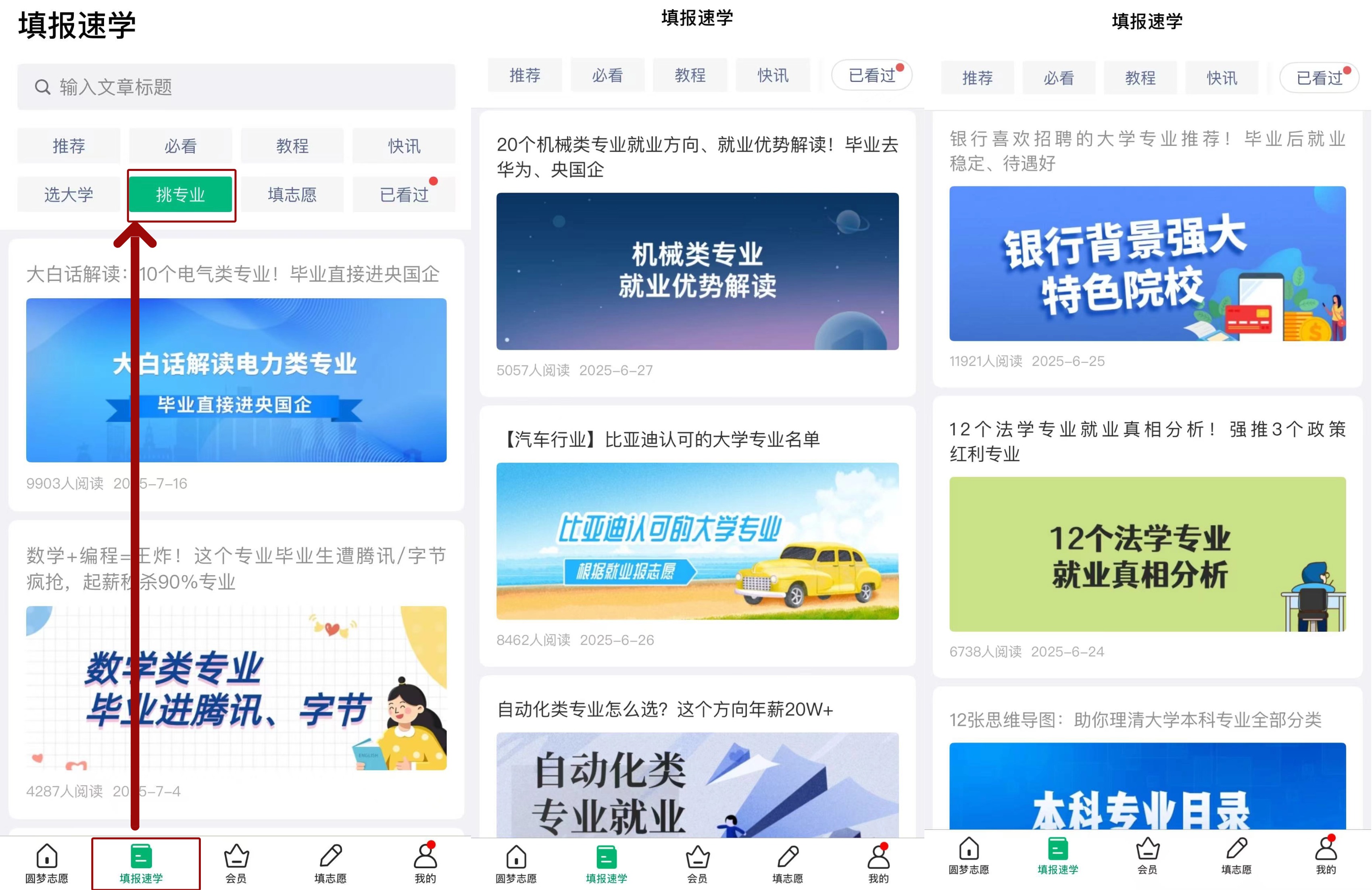 圆梦志愿app的【推文—挑专业】功能可提供专业选择指导。