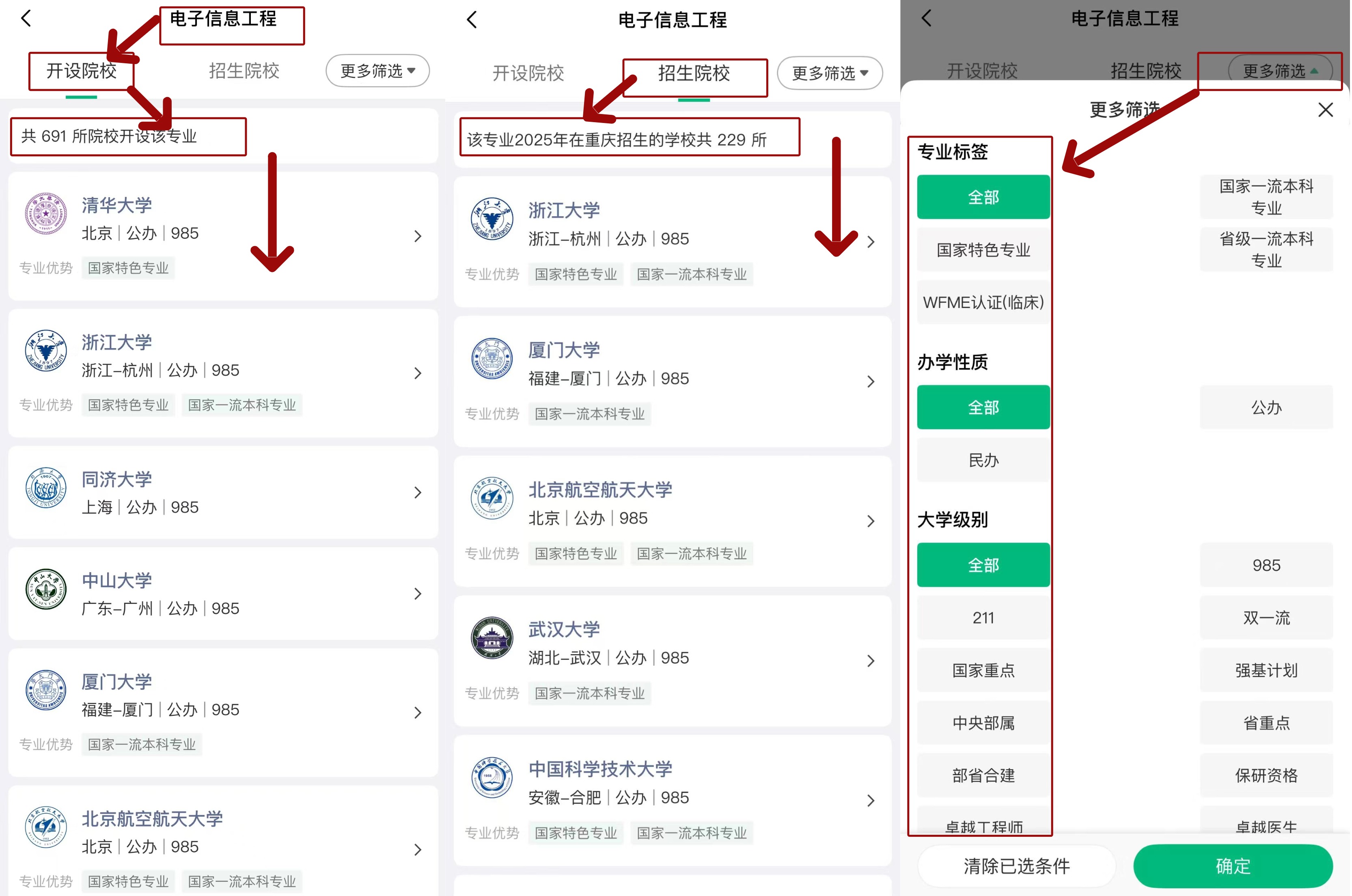 本板块展示某专业的全国开设院校数量,并列出最新一年在考生所在地的招生院校。大家还可根据专业标签、办学性质、院校级别与所在地等条件进行筛选。