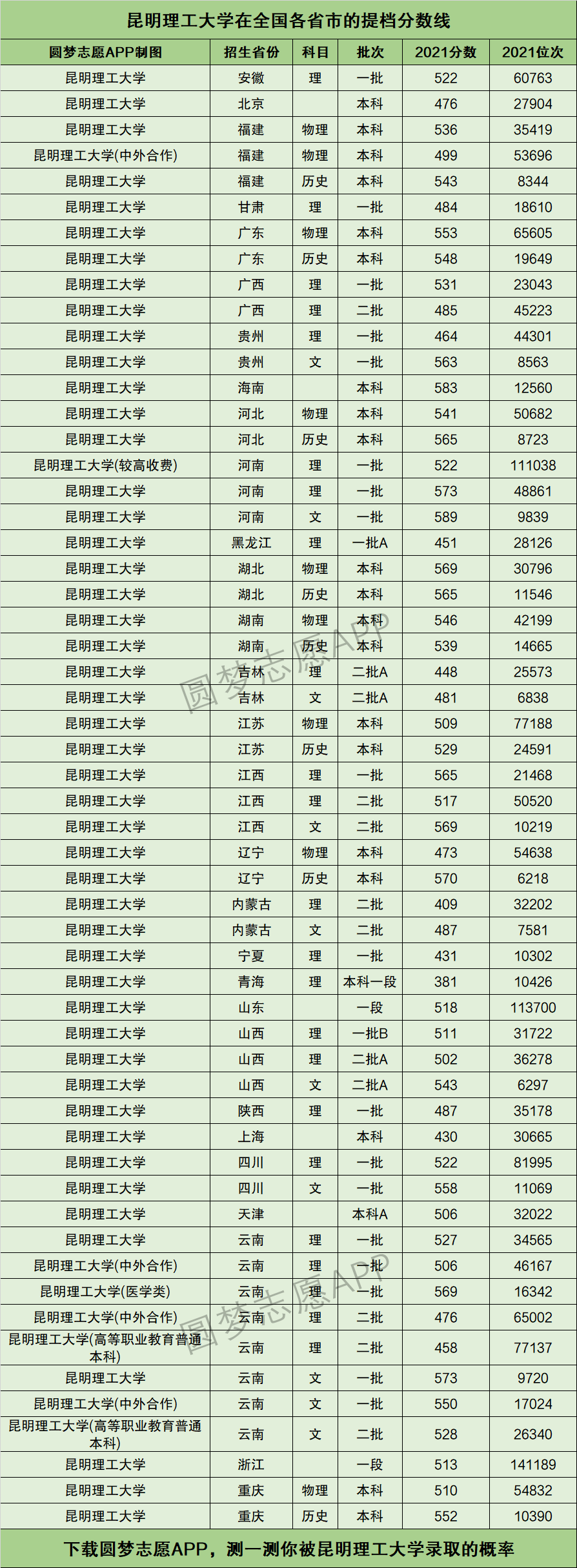 一、昆明理工大学提档线2021年 昆明理工大学位于云南省昆明市,所以小编先为大家单独列出了昆明理工大学在云南省2021年的提档分数线。 1、文科 昆明理工大学在本科一批的最低提档线为573分,最低位次为9720名。 昆明理工大学(中外合作)在本科一批的最低提档线为550分,最低位次为17024名。 昆明理工大学(高等职业教育普通本科)在本科二批的最低提档线为528分,最低位次为26340名。 2、理科 昆明理工大学在本科一批的最低提档线为527分,最低位次为34565名。 昆明理工大学(中外合作)在本科一批的最低提档线为506分,最低位次为46167名。 昆明理工大学(医学类)在本科一批的最低提档线为569分,最低位次为16342名。 昆明理工大学(中外合作)在本科二批的最低提档线为476分,最低位次为65002名。 昆明理工大学(高等职业教育普通本科)在本科二批的最低提档线为458分,最低位次为77137名。 如果你想查看:昆明理工大学各专业——近三年的录取分数线和位次。请直接在手机应用市场下载圆梦志愿APP,获取资料。 二、昆明理工大学在全国各省市的提档线汇总 下图为具体的招录数据,同学们在参考时一定不能只看昆明理工大学的最低分,要重点对比昆明理工大学的最低录取位次↓