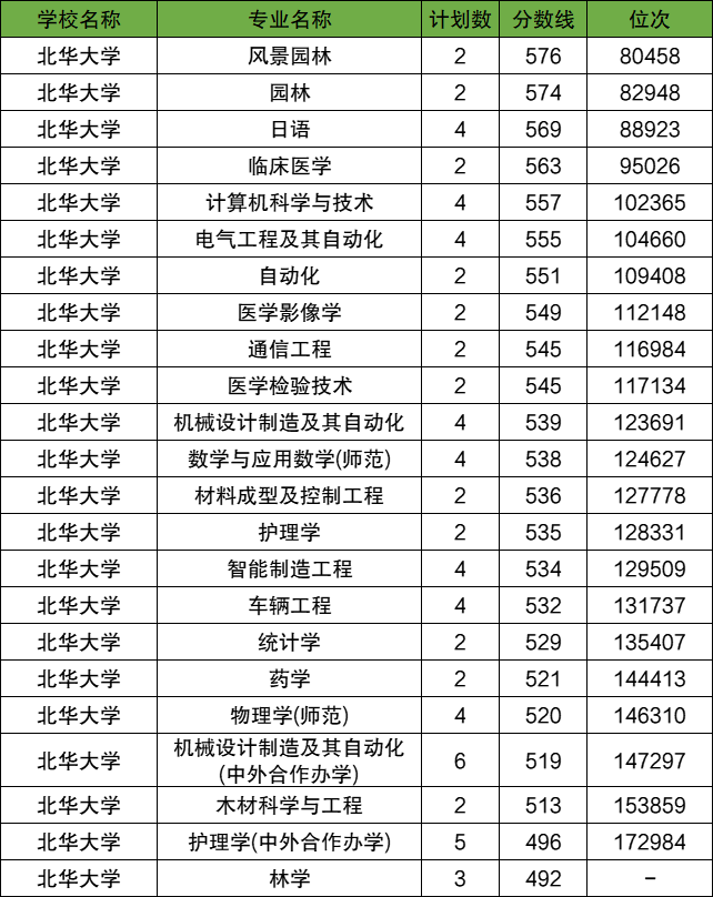 2024年北华大学本科专业最低492分,收分最低的三个专业是林学(492分)、护理学(中外合作办学)(496分)、木材科学与工程(513分)。