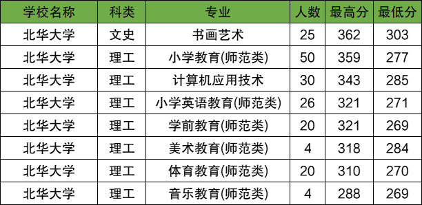 北华大学专科专业最低分数区间在404分-288分,404分对应小学英语教育(师范类)专业,288分对应音乐教育(师范类)专业。