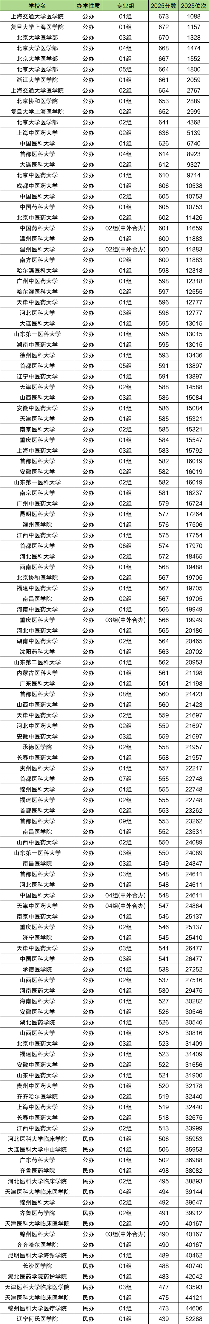 2025年全国各医药类大学录取分数线排名一览表如下: