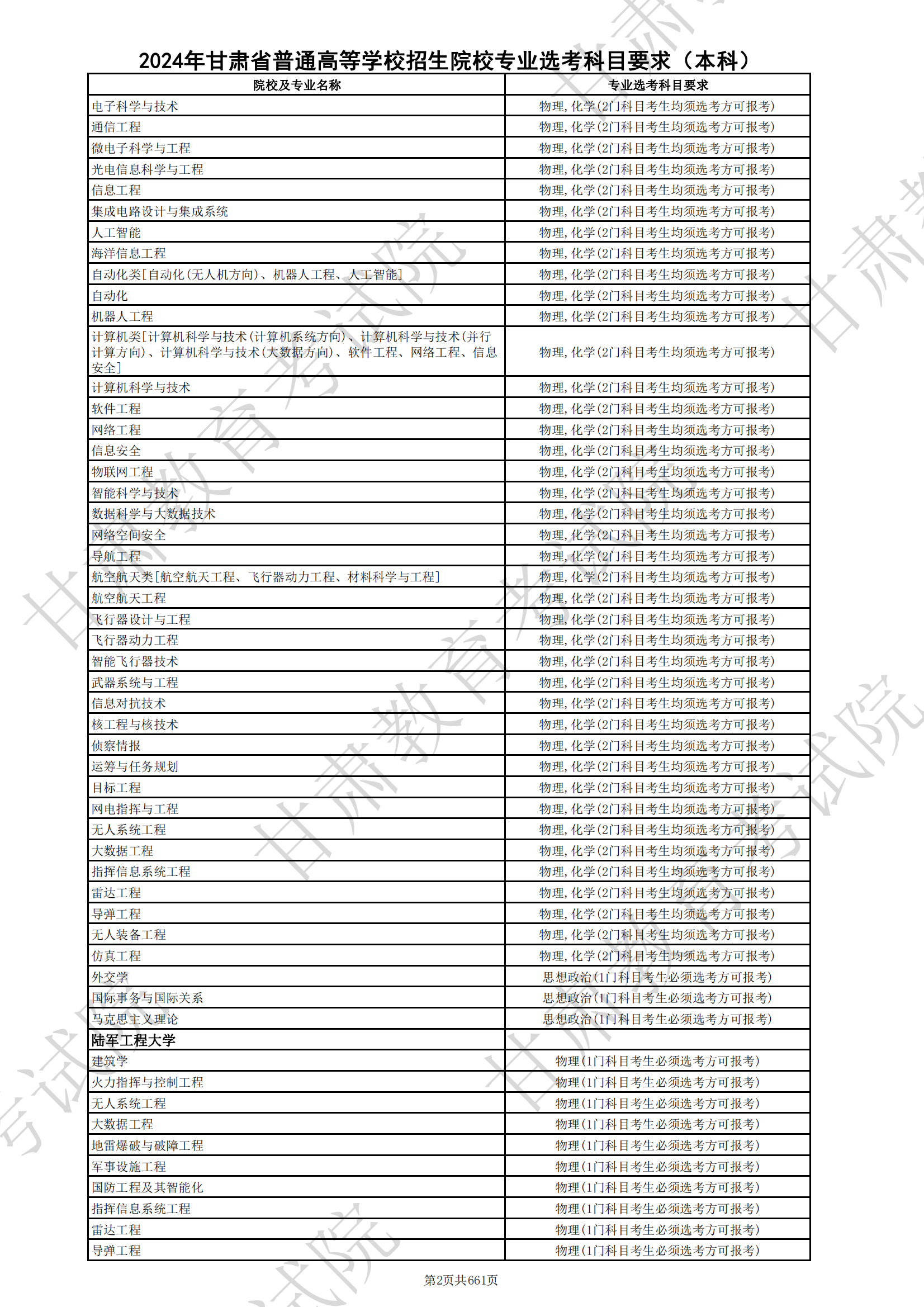 在国防科技大学2024年面向甘肃(3+1+2新高考)招生的专业中,除不作选科要求的专业和管理科学、大数据管理与应用专业只要求选科物理外,其他工学类专业均要求选择物理+化学才能报考。