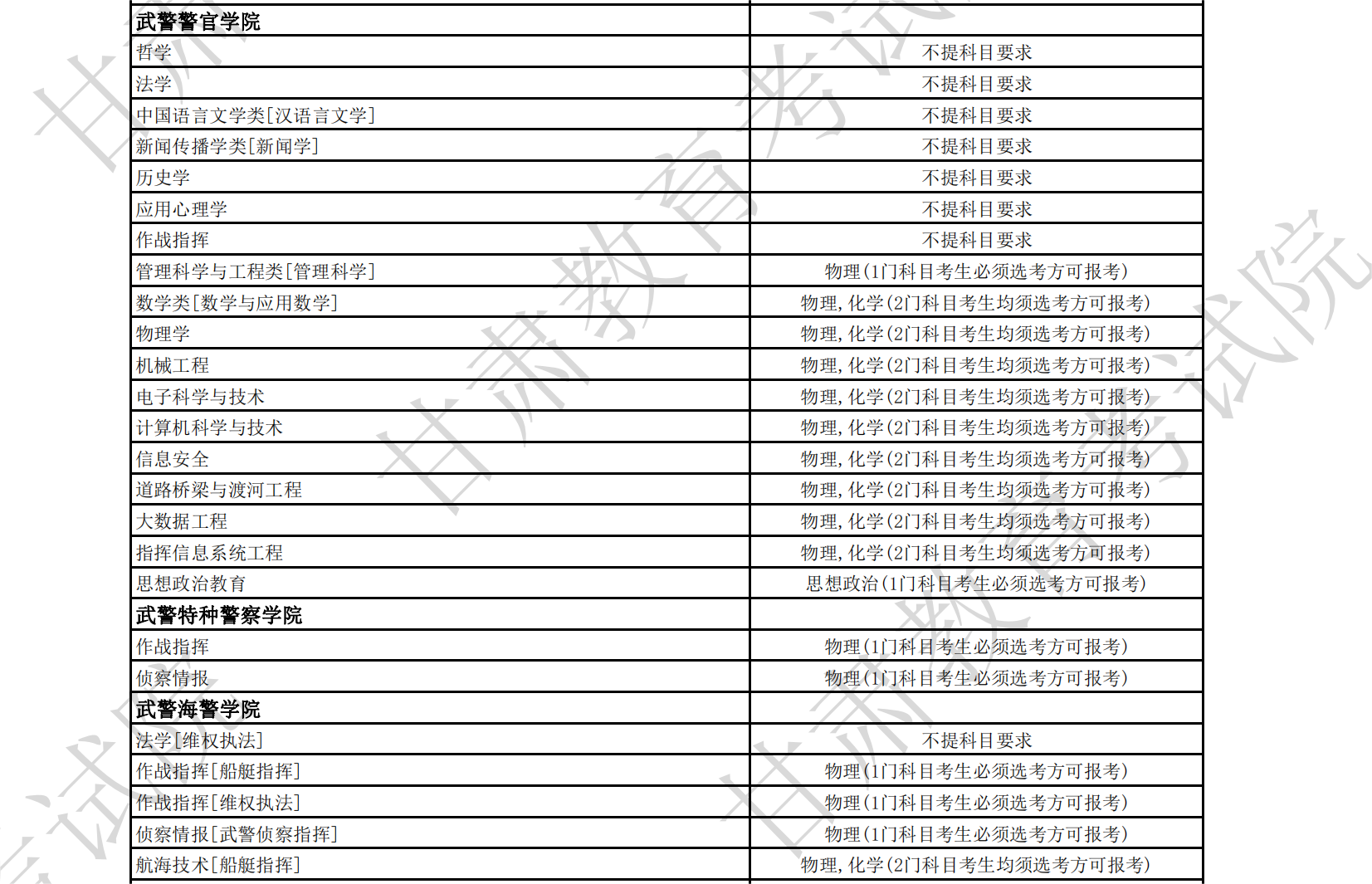 1、武警警官学院:作战指挥专业以及部分人文社科类相关专业如法学、历史学、应用心理学专业都没有选科要求,3+1+2新高考中任意3门选科均可报考。