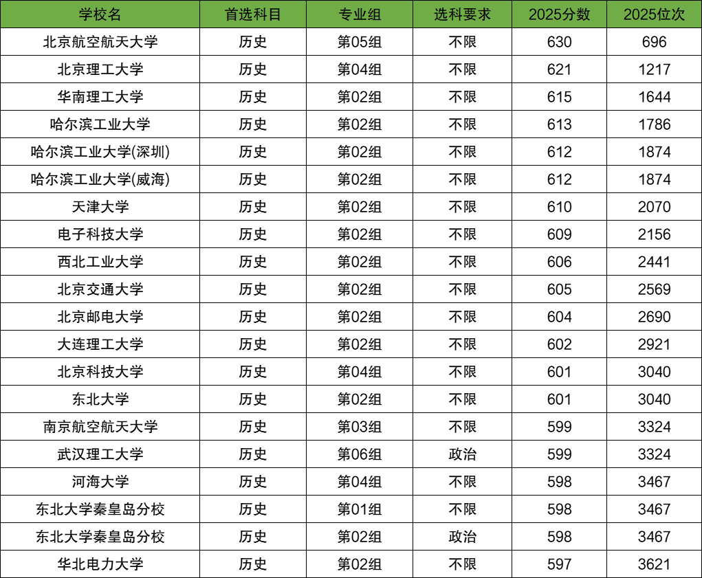 历政化可以报考的理工类大学中,最好的是北京航空航天大学第05组,2025最低分630分;分数线最高的前五名还有北京理工大学第04组(621分)、华南理工大学第02组(615分)、哈尔滨工业大学第02组(613分)、哈尔滨工业大学(深圳)第02组(612分)。
