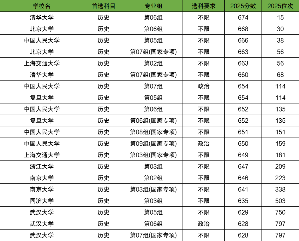 历政化可以报考的综合类大学中,最好的是清华大学第06组,2025最低分674分;分数线最高的前五名还有北京大学第06组(668分)、中国人民大学第05组(666分)、北京大学第07组(国家专项)(663分)、上海交通大学第02组(663分)。