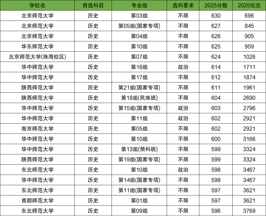 历政化可以报考的师范类大学中,最好的是北京师范大学第03组,2025最低分630分;分数线最高的前五名还有北京师范大学第05组(国家专项)(627分)、北京师范大学第04组(626分)、华东师范大学第10组(625分)、北京师范大学(珠海校区)第07组(624分)。