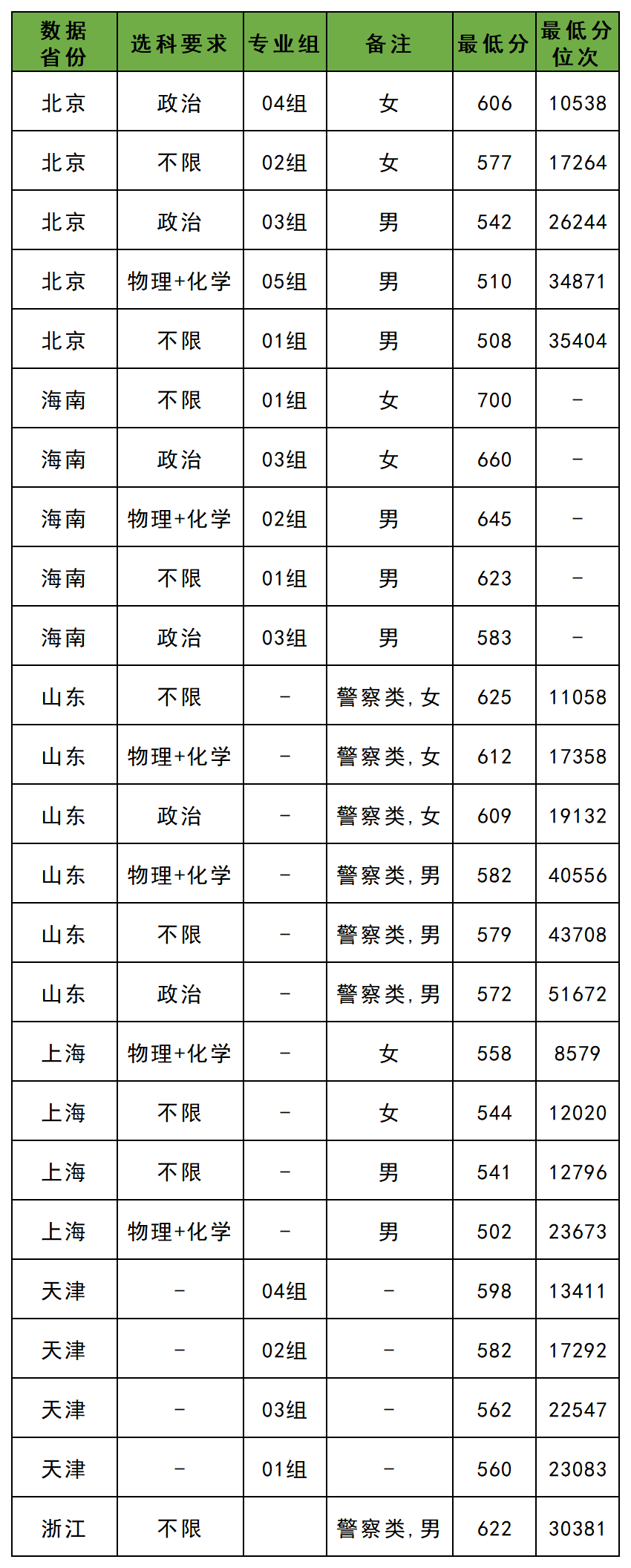 再比如在山东省,中央司法警官学院录取最低分是572分,但这只是在选考政治科目的男生中的最低分,如果是选考政治科目的女生,最低分则高达609分。另外如果是选考科目为物理和化学的,男生最低分582分、女生最低分612分。