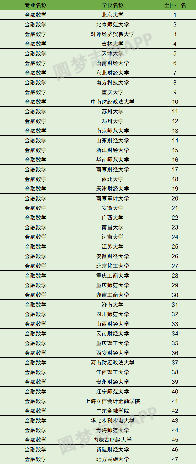 以下为软科中国大学专业排名中,金融数学专业前100名大学。