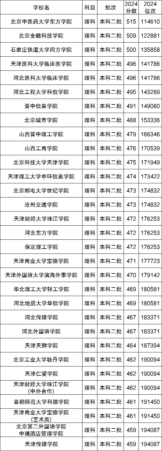 下面是2024年各华北地区的民办本科大学在四川省理科的录取分数线