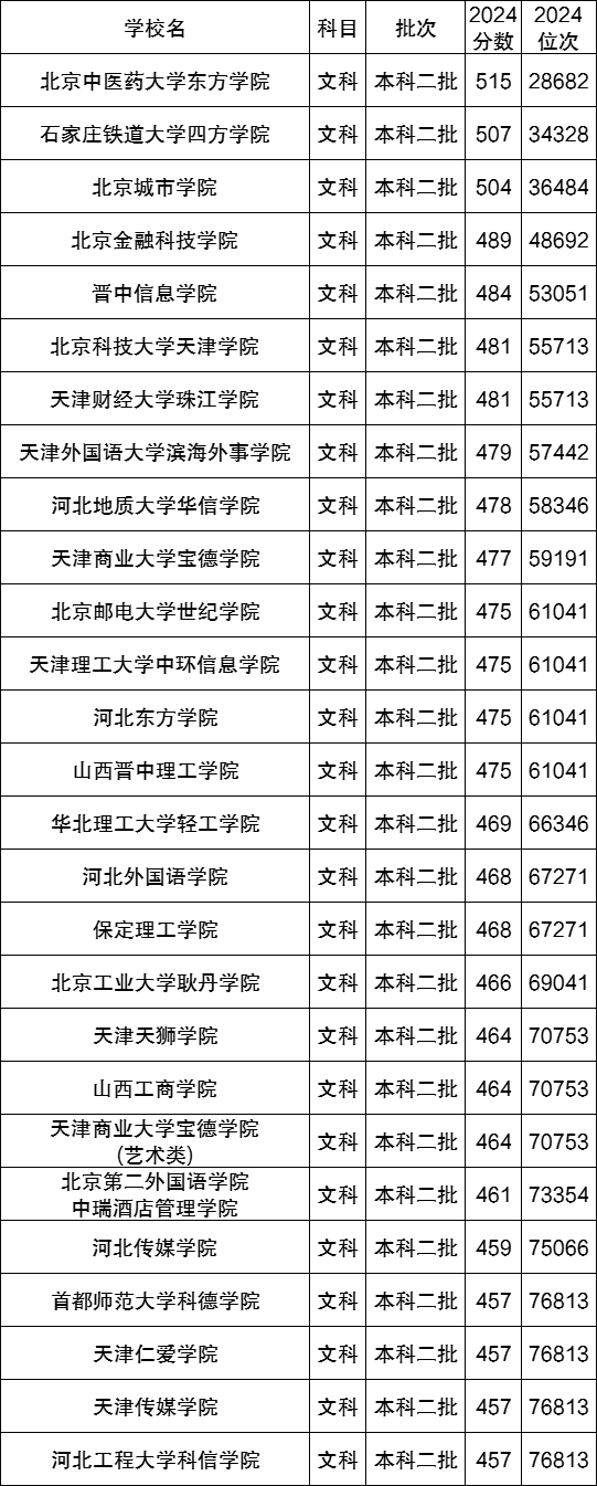 下面是2024年各华北地区的民办本科大学在四川省文科的录取分数线(供参考):