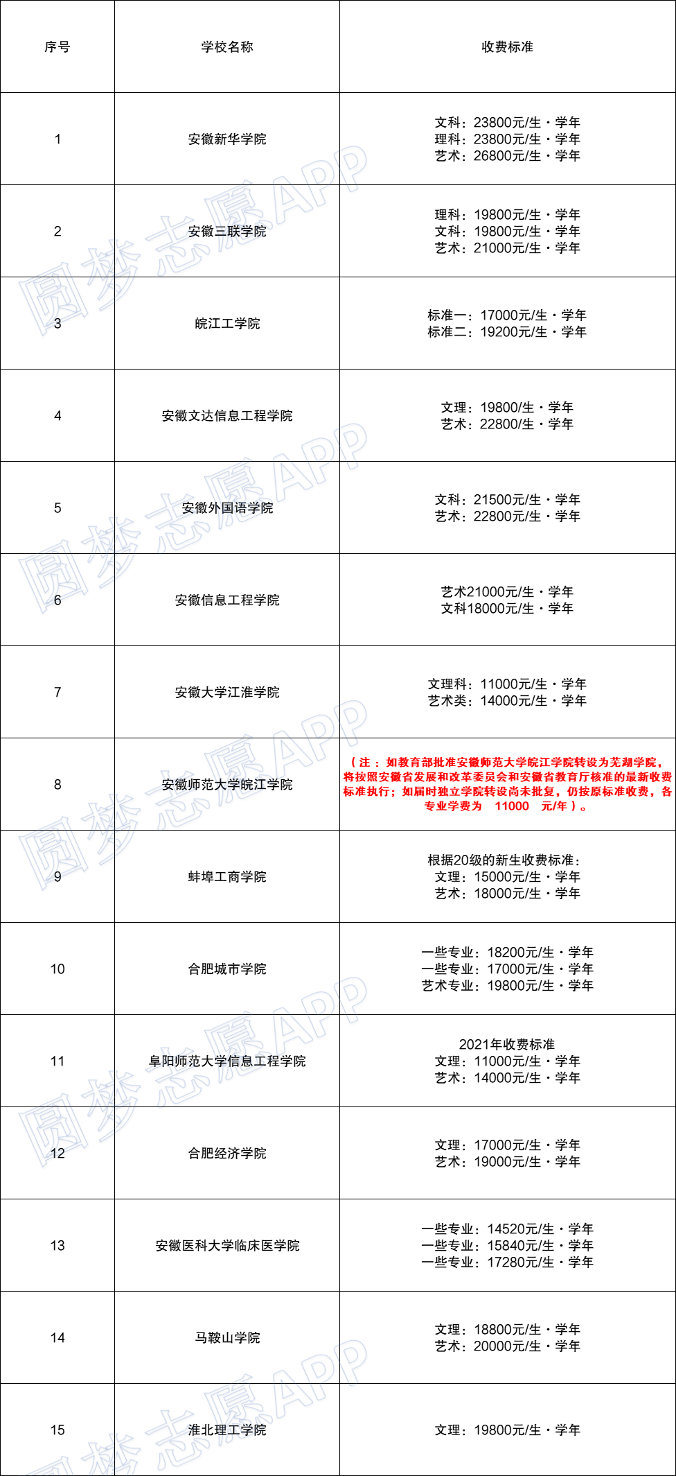 在安徽省所有民办本科中,除了安徽师范大学皖江学院情况特殊以外(涉及转设问题),学费最便宜的是安徽大学江淮学院,文理科的学费是11000元/人·学年,艺术类的学费是14000元/人·学年;还有阜阳师范大学信息工程学院的文理科学费也是17000元/生·学年,艺术类14000元/生·学年。