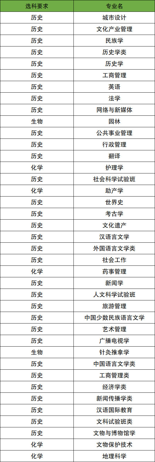 要求选科历史的专业:城市设计、文化产业管理、民族学、历史学类、历史学、工商管理、英语、法学、网络与新媒体、公共事业管理等;