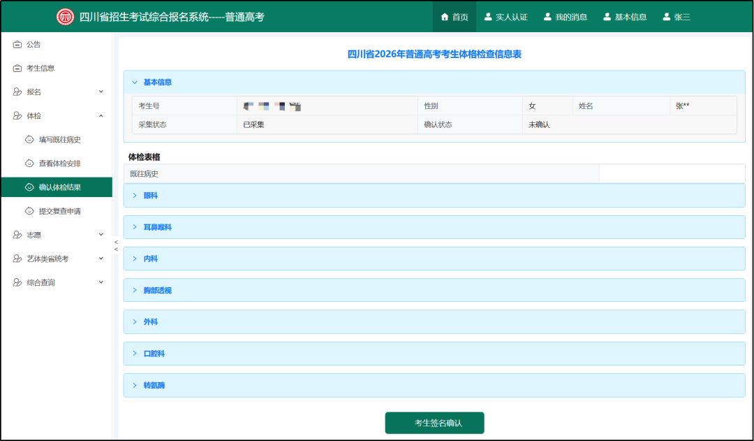 ③体检数据录入并审核后,考生登录系统查询结果并签字确认;