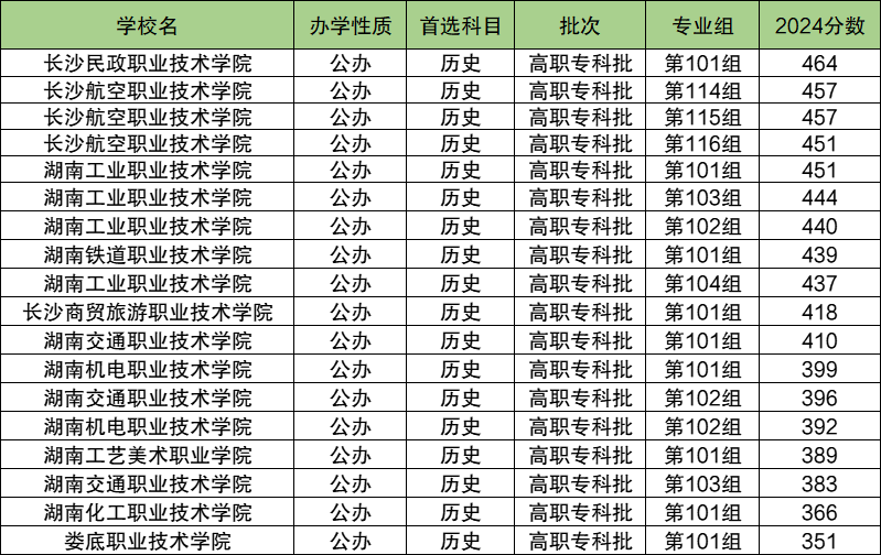 2024年湖南十大专科院校历史类招生分数线范围在351分~464分之间,历史类考生至少要超专科线(200分)151分以上才能报考。