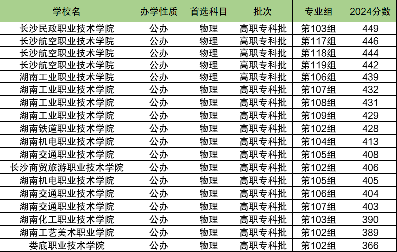 2024年湖南十大专科院校物理类招生分数线范围在366分~449分之间,物理类考生至少要超专科线(200分)166分以上才能报考。