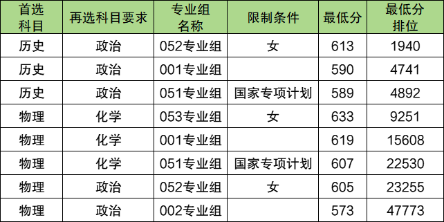 历史类:589分到613分,最低分专业组为051组(国家专项)、最高分专业组为052组(女);