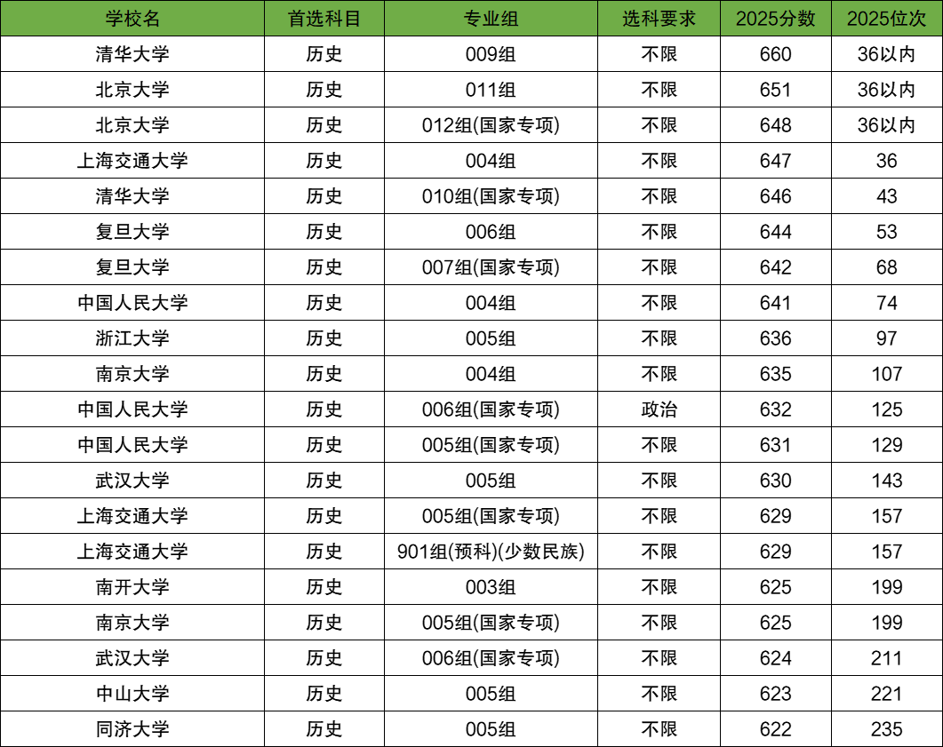 历政生可以报考的综合类大学中,最好的是清华大学009组,2025最低分660分;分数线最高的前五名还有北京大学011组(651分)、北京大学012组(国家专项)(648分)、上海交通大学004组(647分)、北京大学010组(国家专项)(646分)。