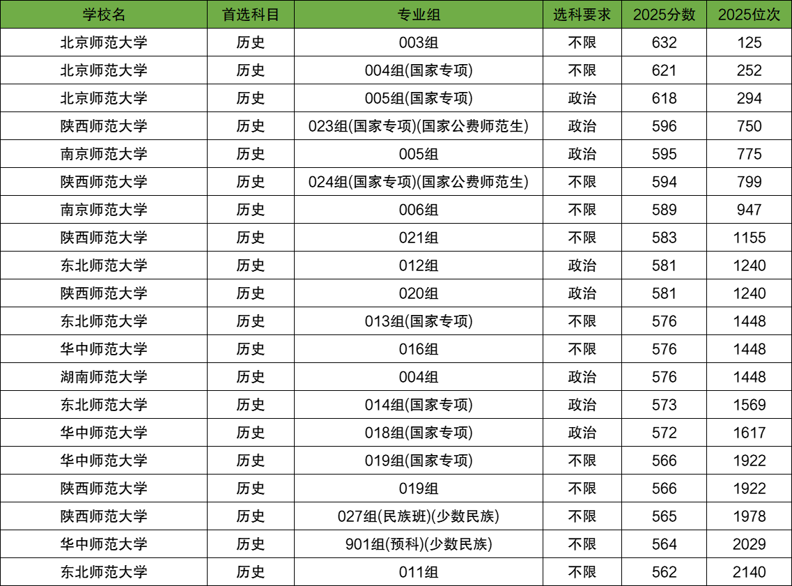 历政生可以报考的师范类大学中,最好的是北京师范大学003组,2025最低分632分;分数线最高的前五名还有北京师范大学004组(国家专项)(621分)、北京师范大学005组(国家专项)(618分)、陕西师范大学023组(国家专项)(国家公费师范生)(596分)、南京师范大学005组(595分)。