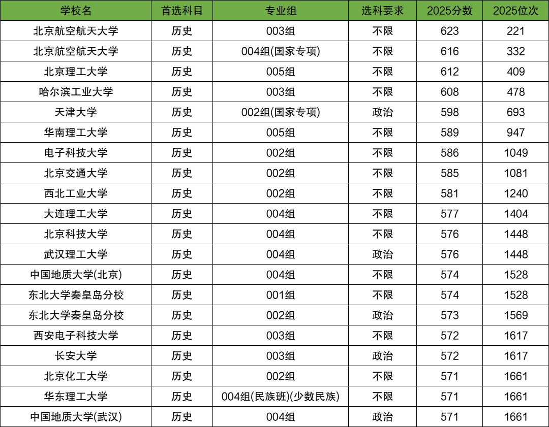 历政生可以报考的理工类大学中,最好的是北京航空航天大学003组,2025最低分623分;分数线最高的前五名还有北京航空航天大学004组(国家专项)(616分)、北京理工大学005组(612分)、哈尔滨工业大学003组(608分)、天津大学002组(国家专项)(598分)。