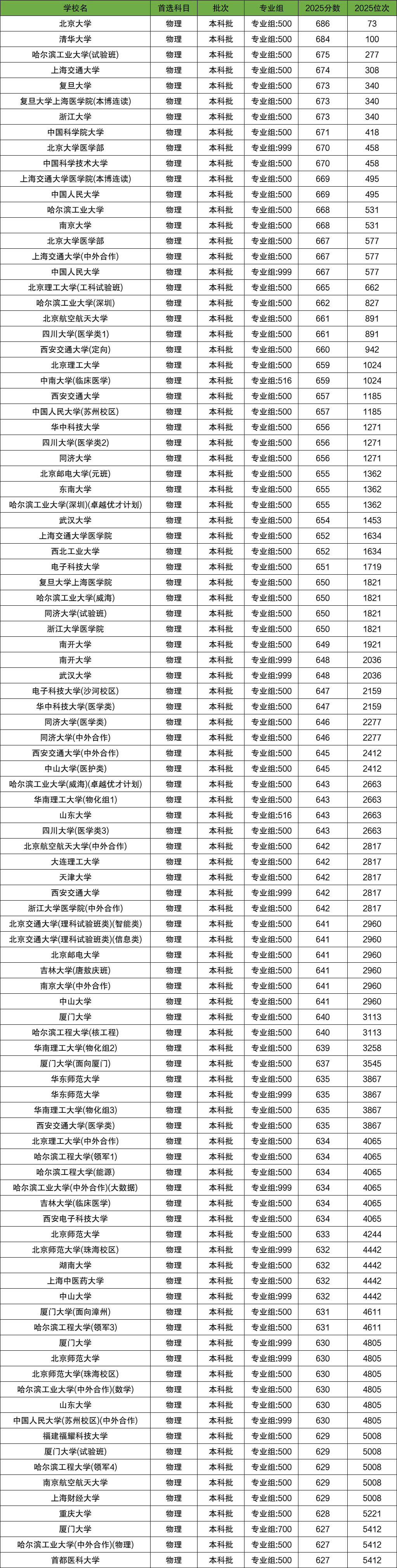 下面是2025年在福建省物理类录取分数线及位次排名前百强高校一览表: