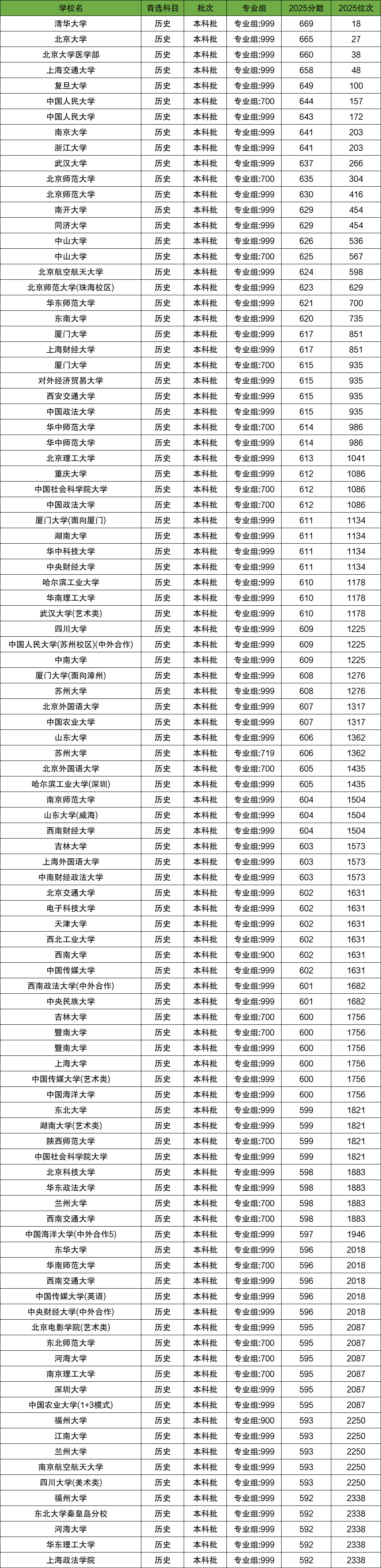 下面是2025年在福建省历史类录取分数线及位次排名前百强高校一览表: