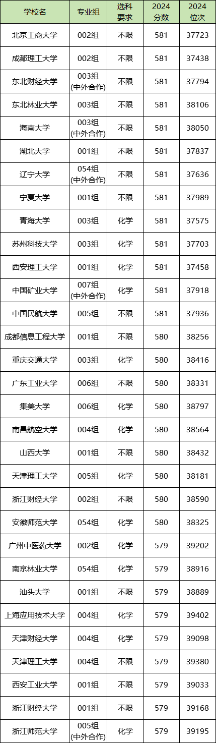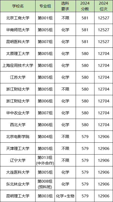 黑龙江物化生580分的考生能上本科大学,均为公办,有北京工商大学001组(581分)、浙江财经大学005组(580分)、昆明理工大学003组(579分)等。具体名单如下表所示: