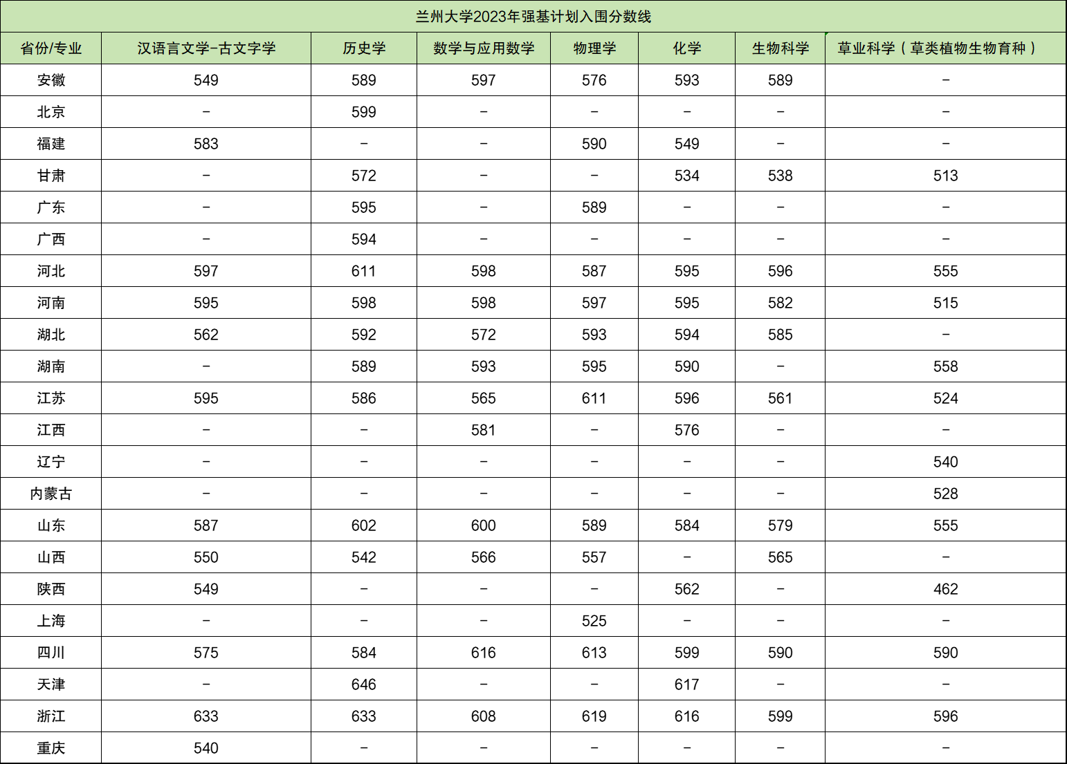 在报名开始前,大家也可以提前了解兰大2023年强基计划的入围分数线,分别是:安徽589分(历史学专业),甘肃化学534分(化学专业)等。