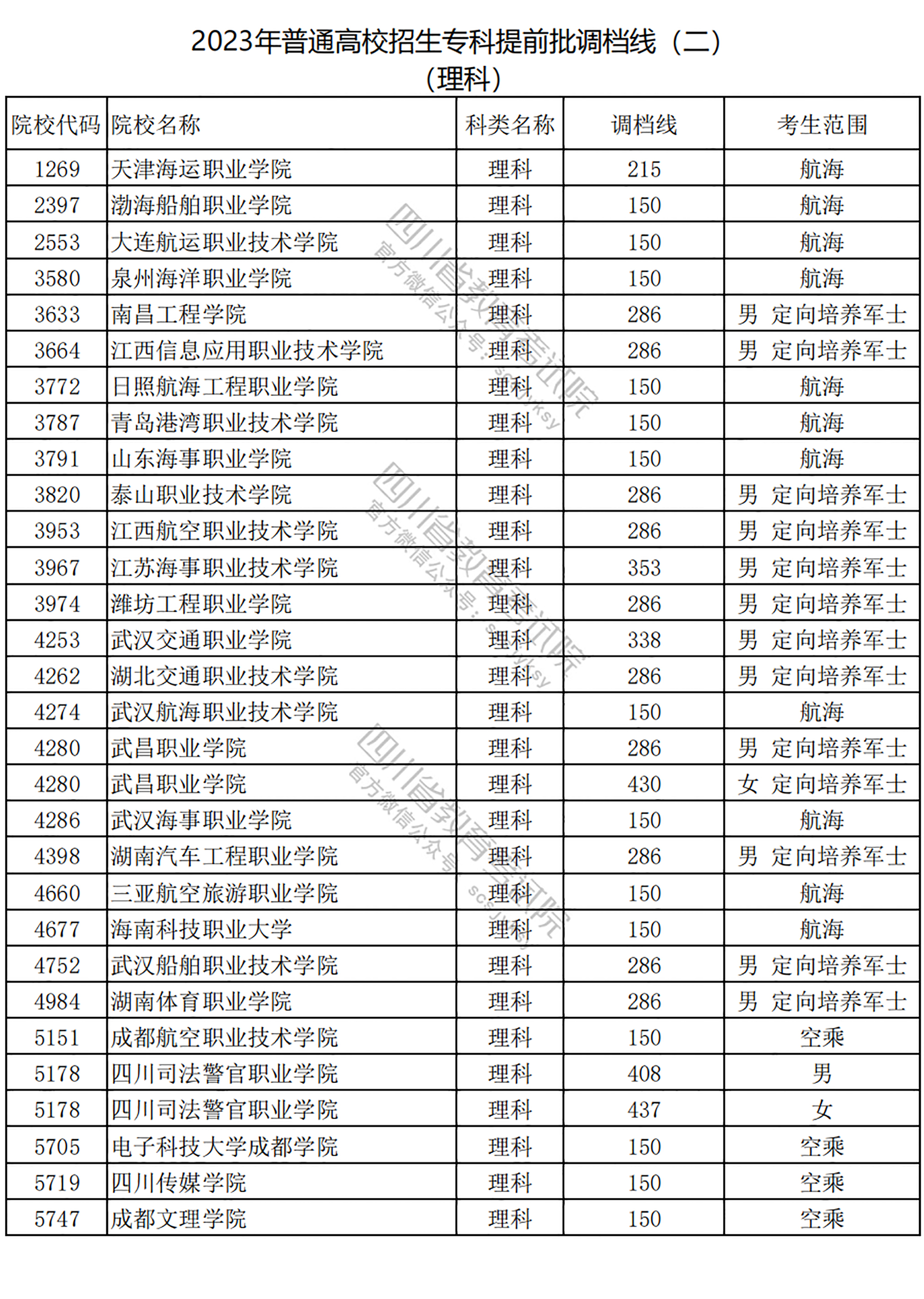 四川男生招生分数线最高的直招士官学校为江苏海事职业技术学院,2023年的调档线为353分。招收四川理科女生的士官学校今年只有一所——武昌职业学院,调档线为430分。