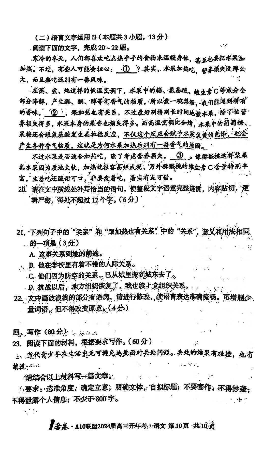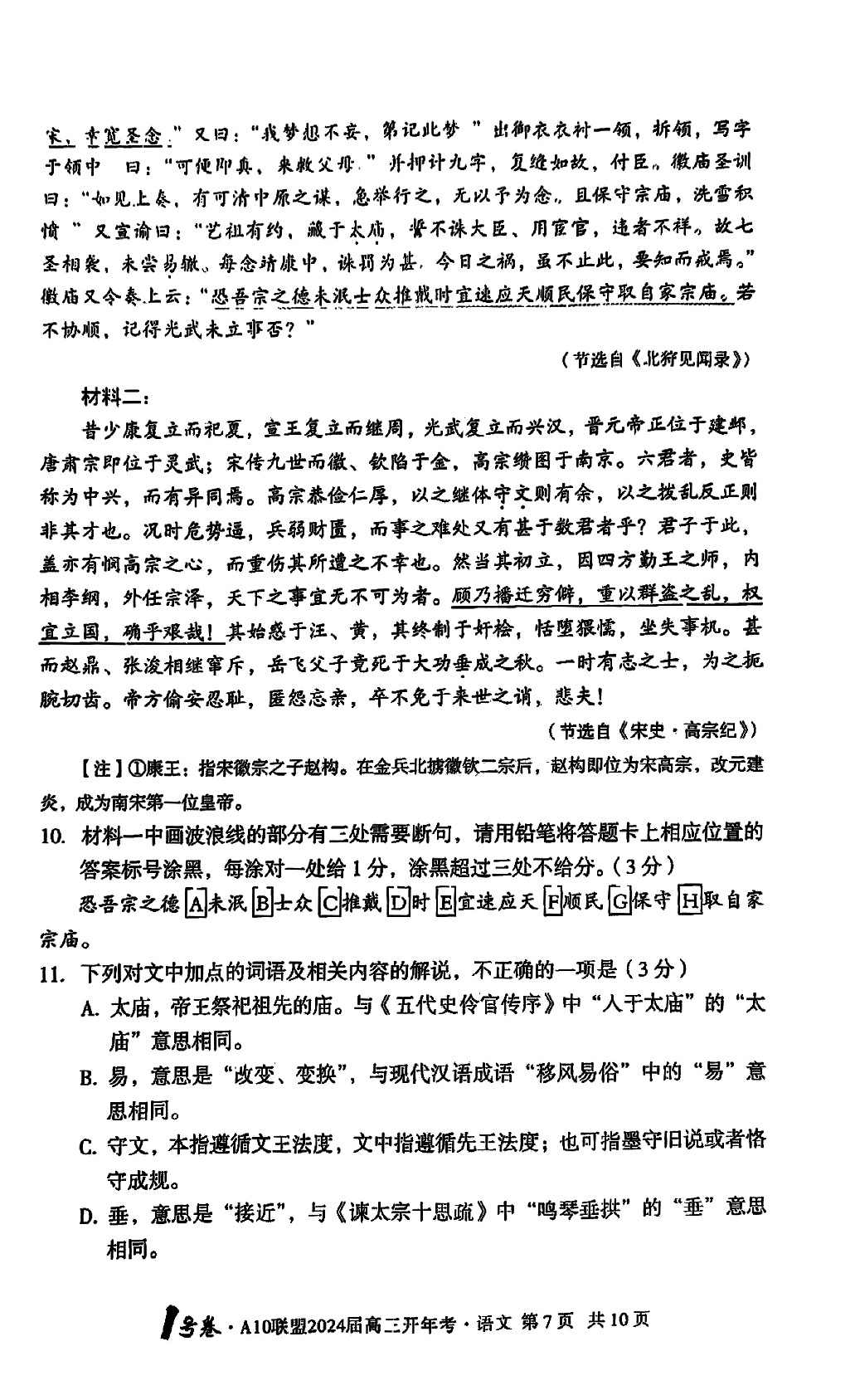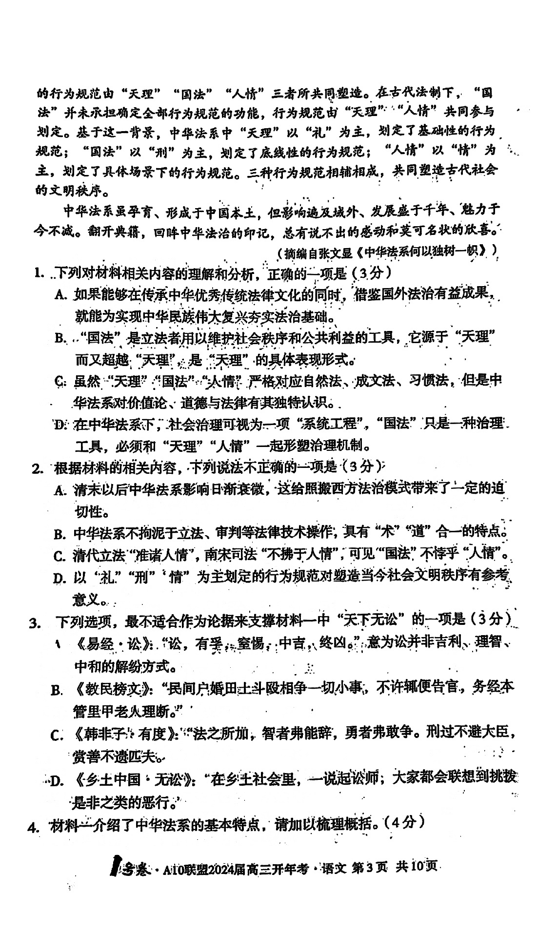1.2024安徽a10联盟高三开年考语文试卷及答案