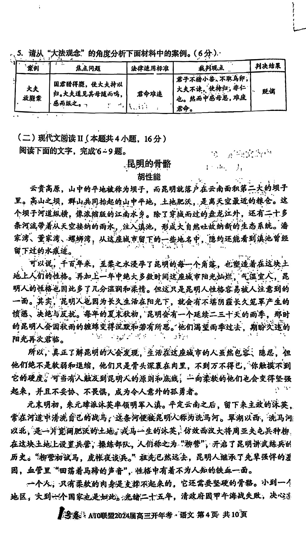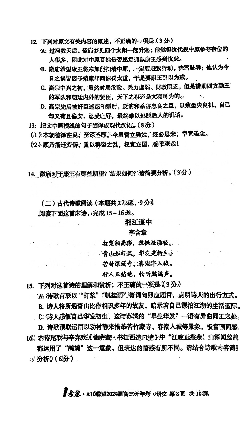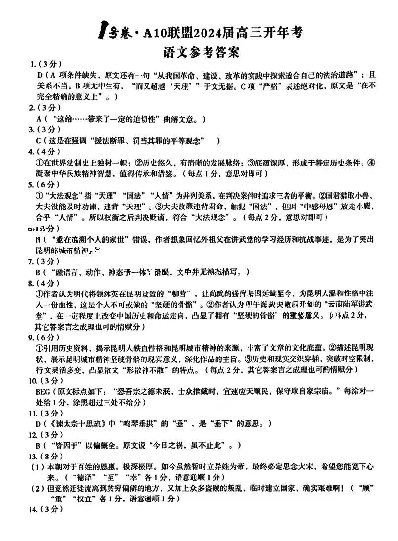 1.2024安徽a10联盟高三开年考语文试卷及答案