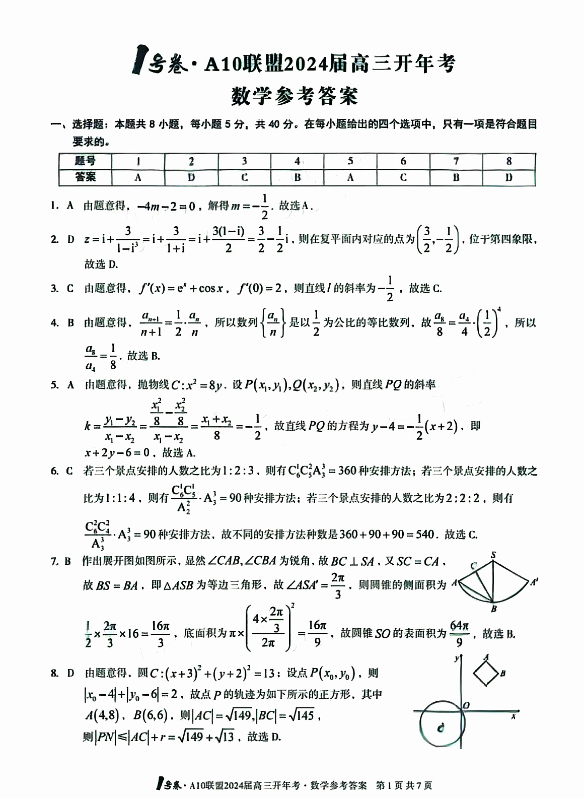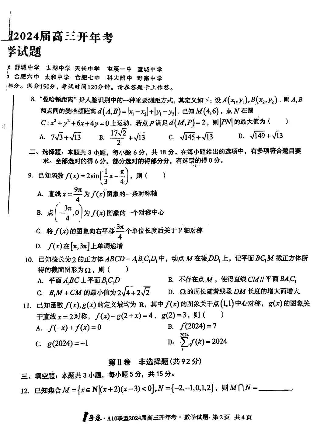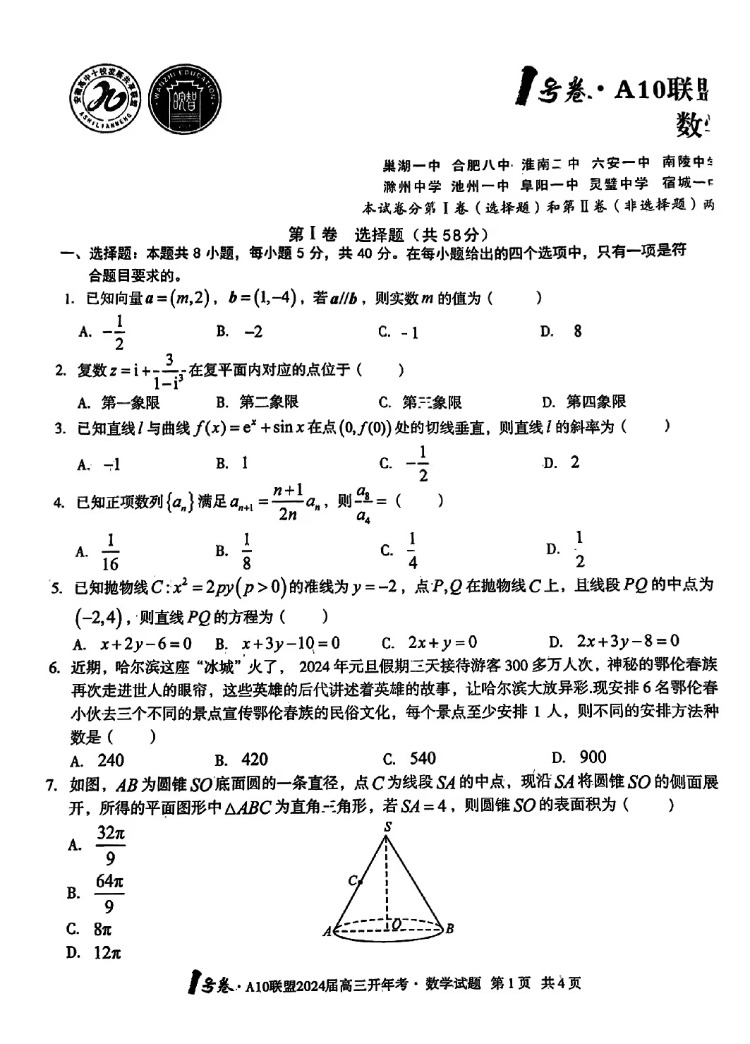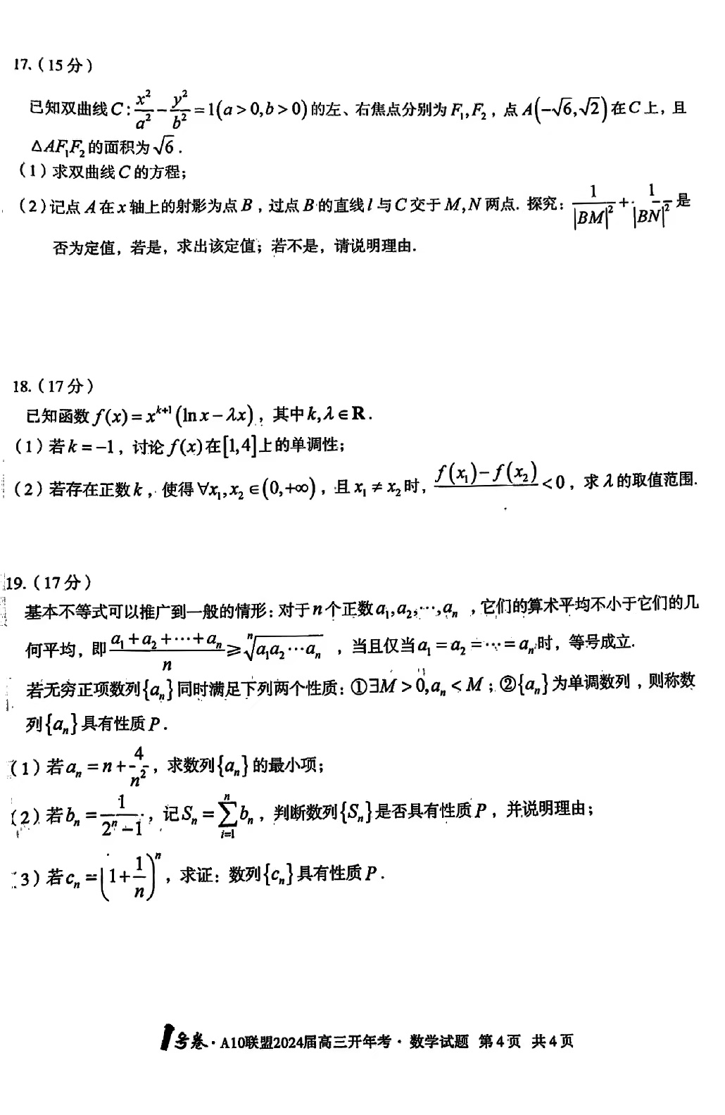 2.2024安徽a10联盟高三开年考数学试卷及答案