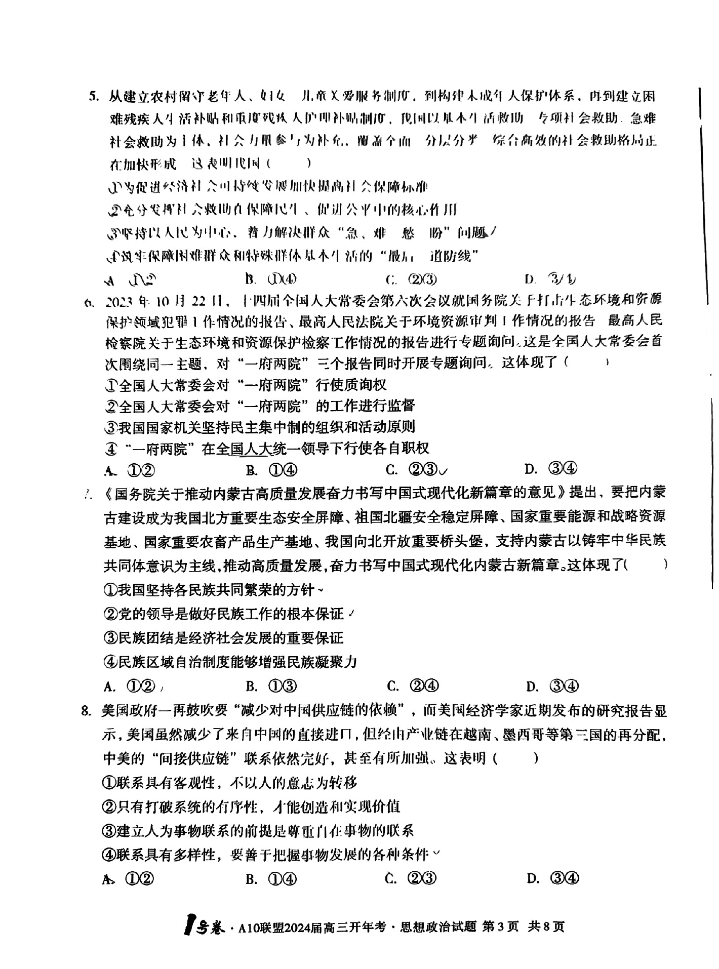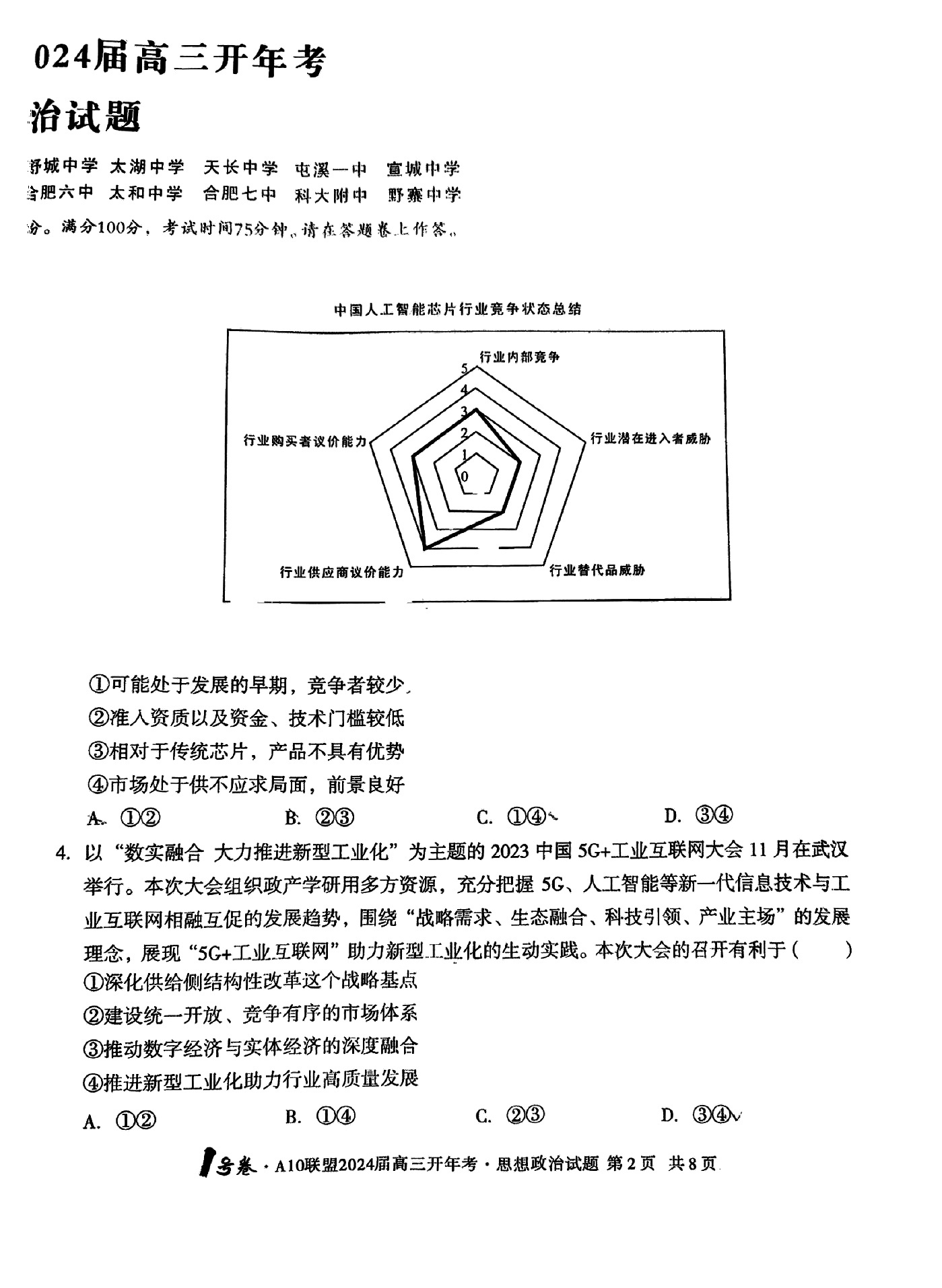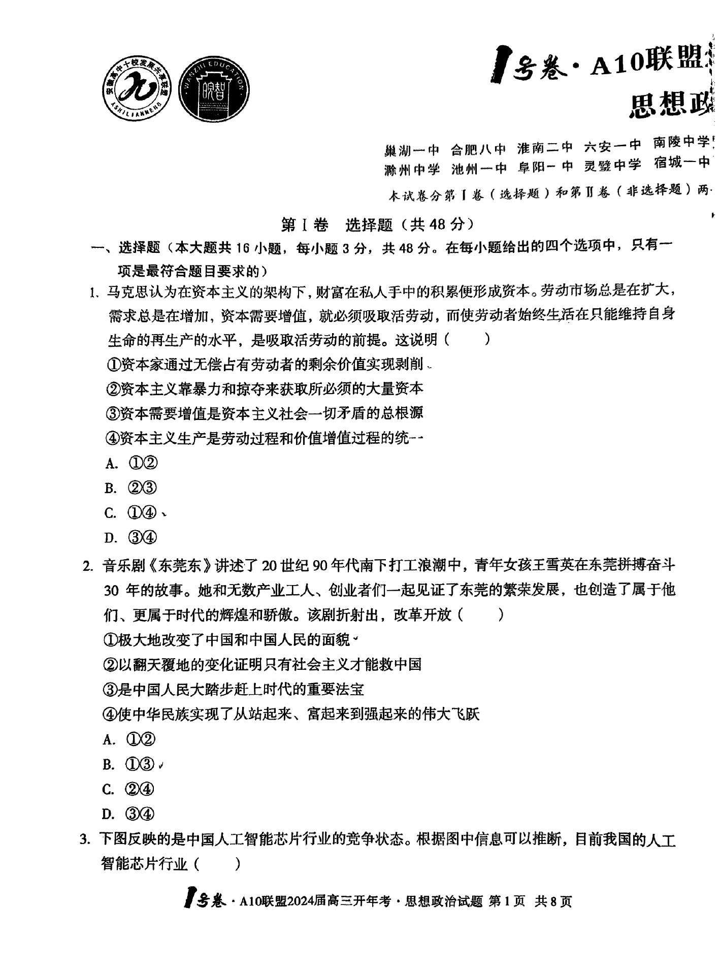 8.2024安徽a10联盟高三开年考政治试卷及答案
