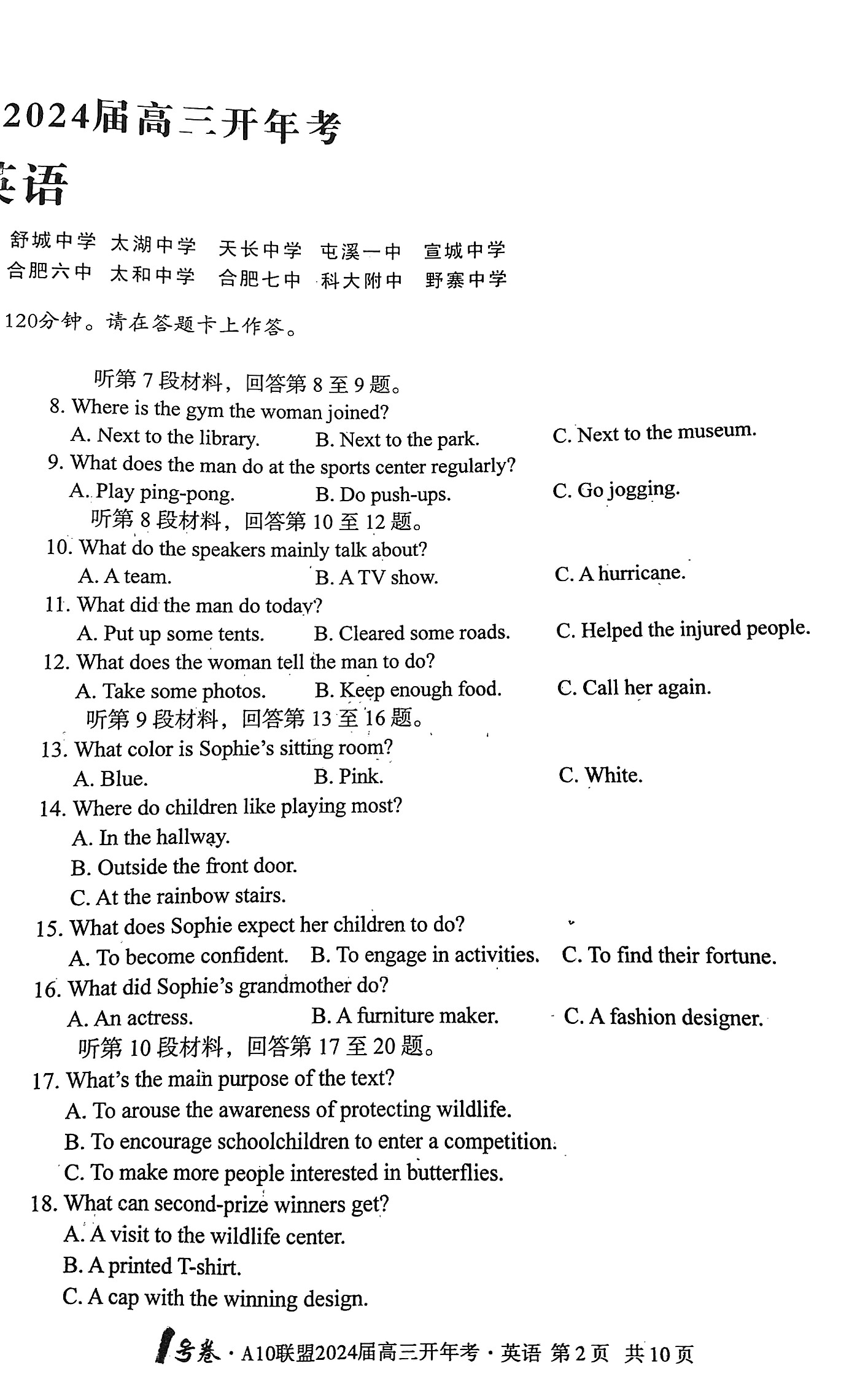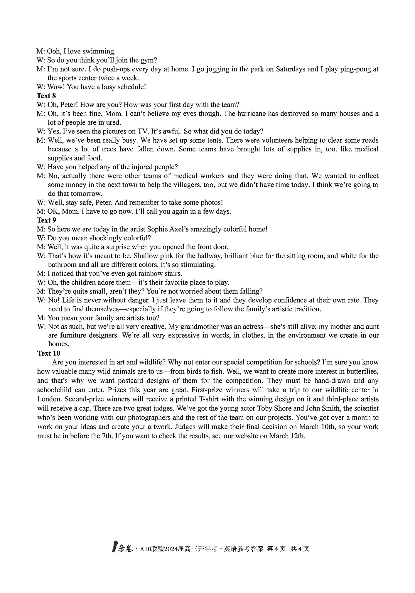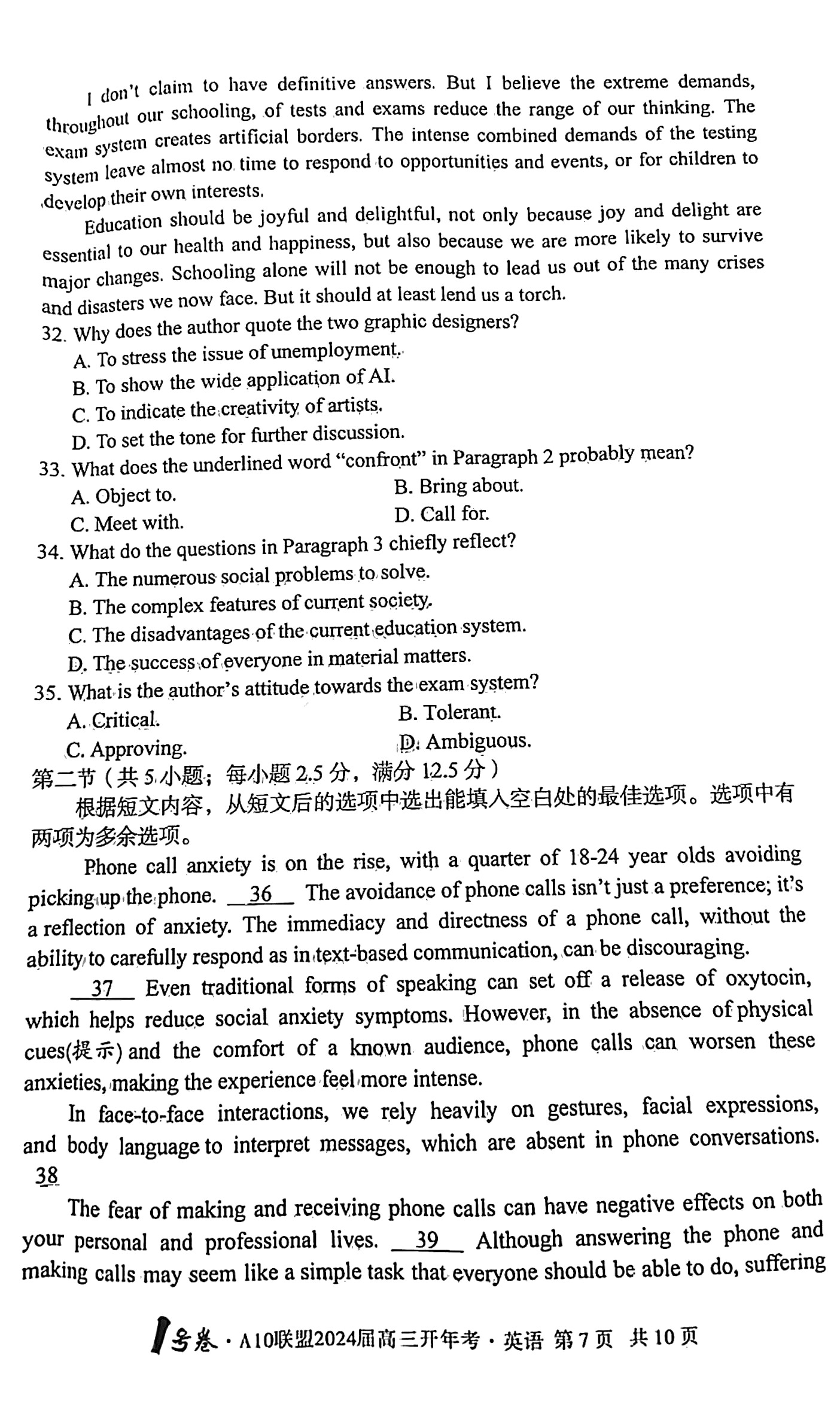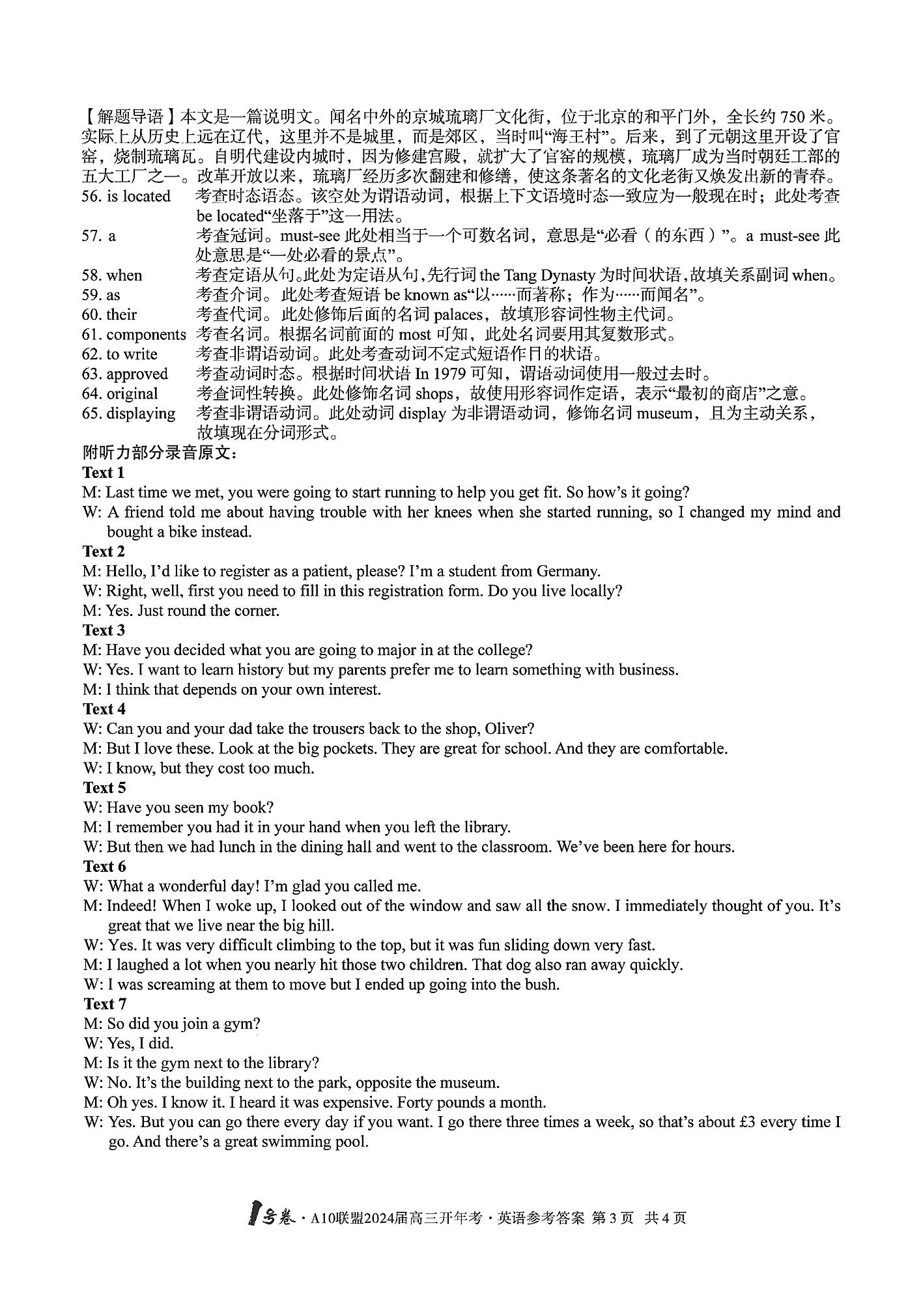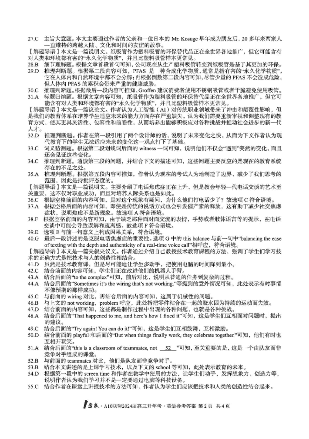 3.2024安徽a10联盟高三开年考外语试卷及答案
